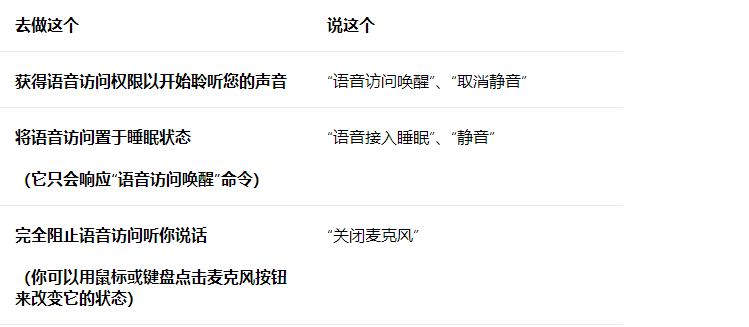 语音访问尚未与“讲述人”等屏幕阅读器完全兼容,将它们一起运行时可能会遇到间隙或意外行为。