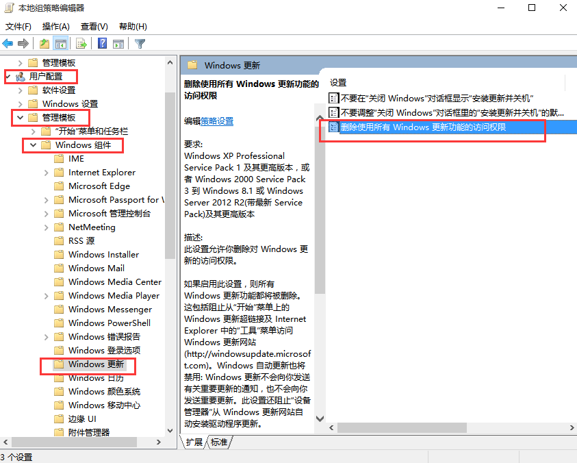 4、之后还需要在用户配置-》管理模板-》windows组件-》windows更新中找到“删除使用所有Windows更新功能的访问权限”,选择已启用,完成设置后,点击“应用”“确定”,如图所示。