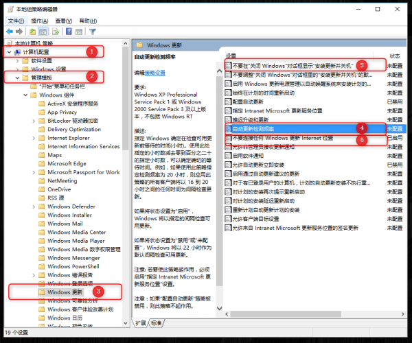 3、进入本地组策略编辑器之后我们依次点击“,计算机配置”、“管理模板”、“Windows组件”、“Windows更新”,然后再“Windows 更新”界面依次点击“配置自动更新”等选项,如下图:
