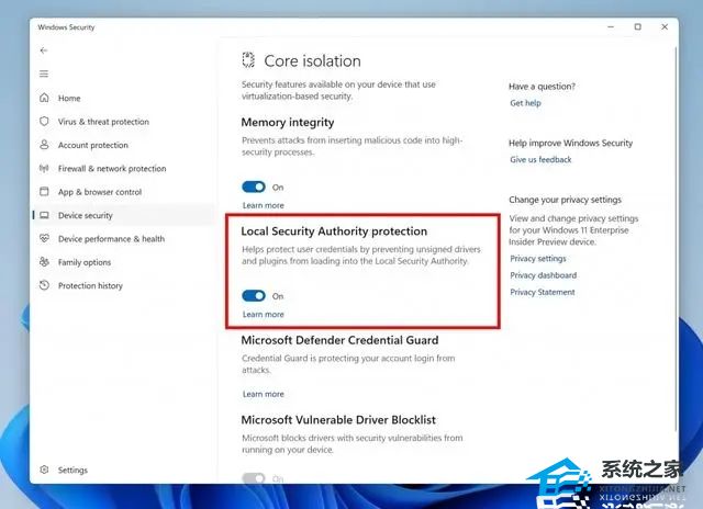 本地安全认证 (LSA) 保护通过防止未经授权的代码在 LSA 进程中运行以及防止进程内存转储,帮助防止用于登录的机密和凭据被盗。从升级开始,微软将审计一段时间以检查与 LSA 保护的不兼容性。如果没有检测到任何不兼容性,将自动打开 LSA 保护。用户可以在设备安全性 》 内核隔离页面下的 Windows 安全应用程序中检查和更改 LSA 保护的启用状态。