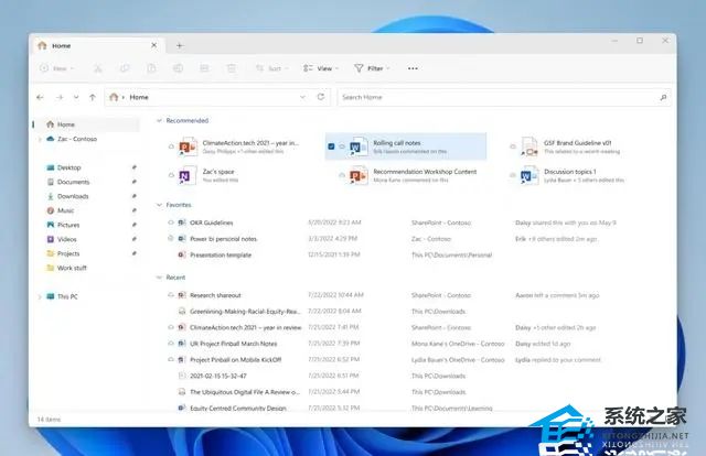 文件推荐(File Recommendations)即将出现在文件资源管理器主页中,让用户最相关的文件内容触手可及。使用 Azure Active Directory (AAD) 帐户登录 Windows 的用户将可以使用此功能(如下图所示)。推荐的文件将是与该帐户关联的云文件,或者由用户拥有,或者与用户共享。