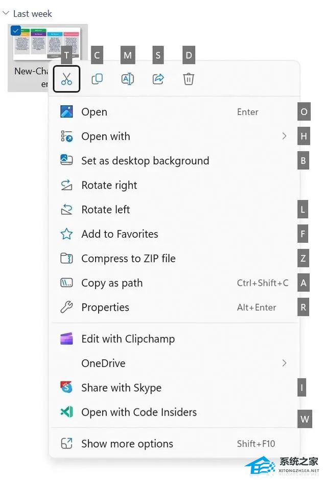 微软正在将访问键快捷方式添加到文件资源管理器的 XAML 上下文菜单中。访问键是一种单键快捷方式,允许键盘用户快速执行上下文菜单中的命令。每个访问键将对应于显示名称中的一个字母。要尝试该功能,用户可以在文件资源管理器中单击一个文件,然后按键盘上的菜单键。