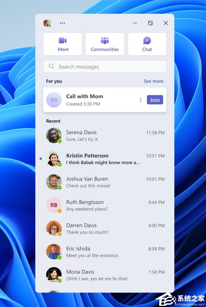 点击启动 Microsoft Teams(免费版)的 Windows Insiders 将看到一个小型的通讯聊天窗口,只需点一下或两下即可与其他人进行聊天、通话和会议,而且你可以将该窗口放在桌面上的任何位置,而且可以在浏览网页或社区时保持置顶可见。