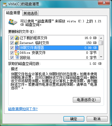 1.删除垃圾文件。Vista使用一段时间后系统就会留下很多垃圾文件,垃圾清除可以借助“磁盘清理”组件。单击“开始→所有程序→附件→系统工具→磁盘清理”,启动磁盘清理后选择“清理所有用户的文件”,然后选择“清理C盘”,勾选所有要删除的文件,单击“确定”。这里仅仅选择“休眠文件清理器”就可以回收0.99GB的空间(见图1)。