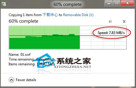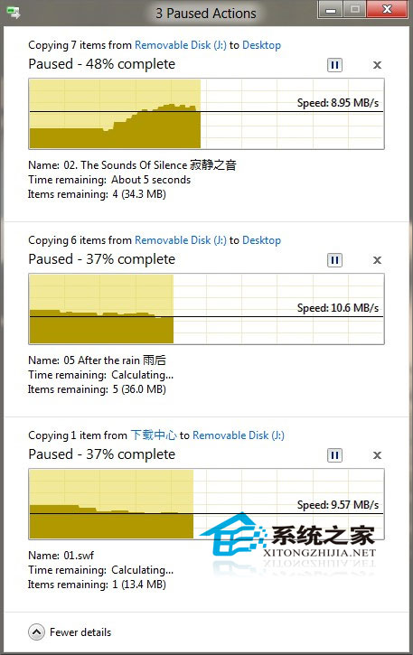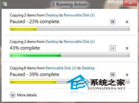 “复制”、“粘贴”恐怕是Windows中资格最老的两项功能,多年来一直没有什么变化。而在Win8中,这项功能被明显赋予了新意。首先是大家期盼以久的进度框集成,以往当我们在执行多任务复制时,每项任务都会产生一个进度框,许多进度框层叠一起,难以分辨也不太容易管理。而在Win8中无论同时执行着多少组复制任务,系统都会很知趣地将其自动合并一起,除了查看和管理更加方便外,你甚至可以在某项任务过分占用系统资源时(如大文件复制)手动将其暂停,然后当其他任务执行完毕后继续复制,以免耽误那些更着急的操作。