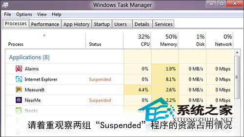 与我们之前习惯的程序打开与关闭不同,Win8中引入了第三种程序状态——“Suspended”(挂起)。简单来说就是当我们在Metro界面下打开一组程序后,再次按动Win键返回Metro主菜单时,之前这些程序会自动进入Suspended状态(任务管理器可以看出),以节省系统资源。
