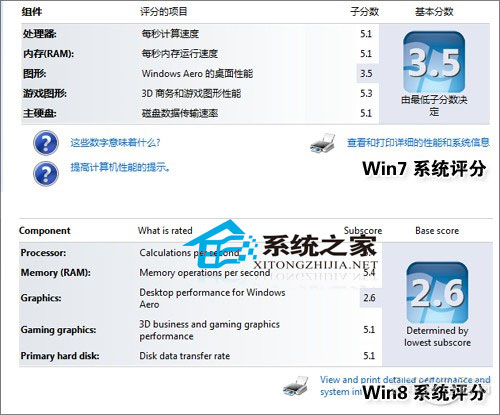 如果你仔细观察的话,就会发现,即使同一台电脑安装了相同的驱动,其Win7与Win8的评分也不会一样。就拿笔者这台电脑而言,Win7下显卡得分3.5分,但Win8下就只有可怜的2.6分了。其实之所以显卡得分下降,并不意味着这款显卡不能在Win8下很好工作,只不过是Win8对于显卡的要求更高而已。