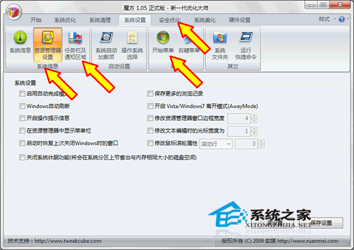 我们可以通过魔方,在“系统设置→任务栏及通知区域”、“系统设置→开始菜单”、“安全优化→系统安全设置”、“安全优化→控制面板”等模块中进行进一步的设置,例如禁用控制面板、禁用管理工具、禁用任务栏右键菜单等等。这些功能不仅简单而且有效,大家可以根据具体的使用环境有针对性的选择使用。