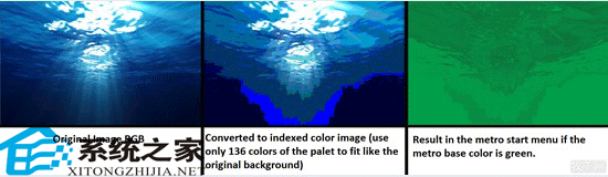 和开发者预览版不同的是,在Win8 Pre-beta版本中,我们已经不再能通过编辑器来自定义一个rgb三色组合的图片使其成为背景了,我们需要一个8位索引颜色的图片。如果我们不使用这种格式的话,新的背景显示出来就不会是图片原来的颜色。