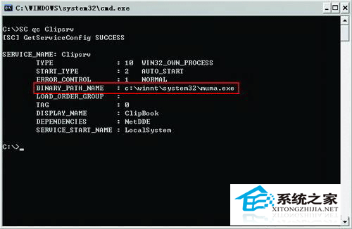 从sc的qc命令中我们可以得知ClipBook服务的可执行文件路径为C:windowssystem32clipsrv.exe,我们将木马文件放置于c:windowssystem32目录,这样做的目的是为了增加木马文件的隐蔽性。返回“命令提示符中”输入命令“sc config clipsrv binpath= "c:winntsystem32muma.exe”回车后,ClipBook服务的可执行文件就被我们换成了muma.exe,我们可以再次使用qc命令进行确认。至此,系统服务的替换就完成了。