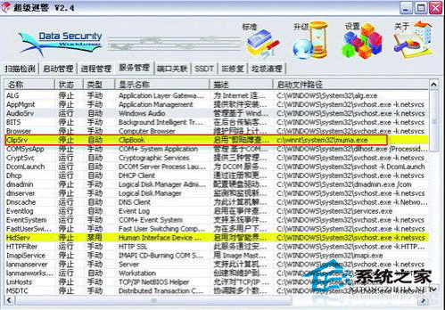 如果你对服务不是很了解,并不代表就对黑客所替换的系统服务无能为力,借助一些安全工具,我们还是可以将被替换的服务找出来的。查找被替换的服务我们可以借助“超级巡警”这款安全工具,安装后运行其主文件,然后点击工具栏上的高级按钮,接着切换到“服务管理”标签,如果系统中有服务被替换,在这里会以黄色的条目标出,哪些服务有问题一眼便知。找出被替换的服务后,右键点击,选择“编辑服务”,将可执行文件的路径改回来即可,最后别忘了将藏在系统中的木马程序删除。