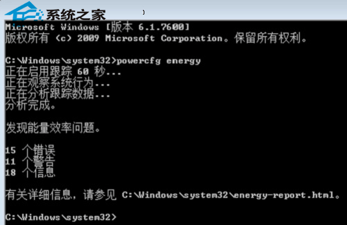 开始→所有程序→附件→命令提示符(右键选择以管理员身份运行)→powercfg energy→回车, 如图: