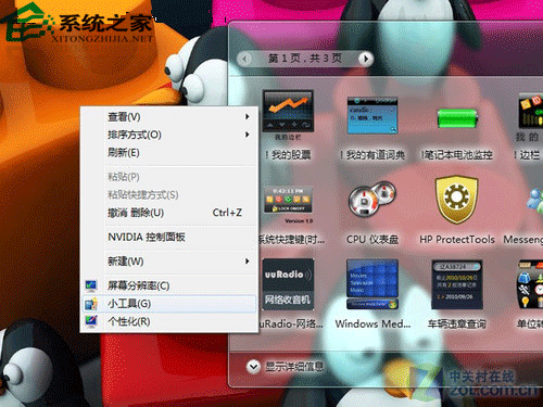 Windows 7默认并不开启小工具,需要手动操作,办法十分简单,单击鼠标右键,选定“小工具”即可开启菜单,每页可显示十八个工具,日后工具多了,可以通过右上方的搜索功能快速找到已经添加好的项目。