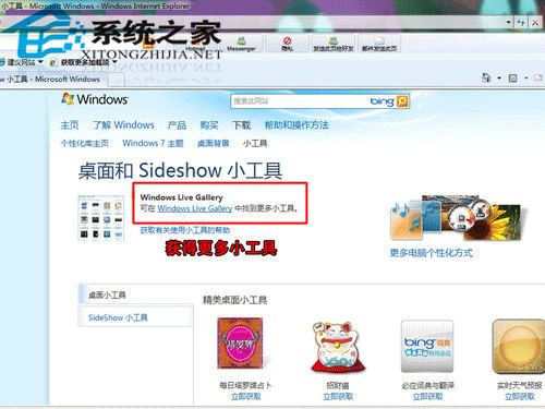 安装小工具办法比较简单,首先需要连接网络,然后点击菜单右下方的“联机获取更多小工具”,随后屏幕将跳转至“桌面和Sideshow小工具”页面。