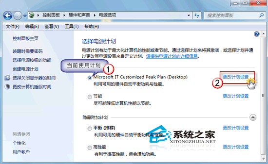 3.选中当前使用的电源计划,单击其右侧的“更改计划设置”链接。