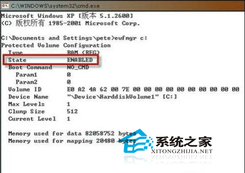 EWF安装完成后,我们如何得知其保护状态呢?点击“开始”→“运行”,输入“cmd”运行“命令提示符”,输入命令:“ewfmgr c:”并回车,在回显信息的“state”这项中我们可以看到其状态为“ENABLED”,则说明EWF正在保护中。“Type”这一项显示为“RAM”,也就是内存,说明我们所有的操作都会被存储在内存中,下次重启后所有写入的数据都会被还原。