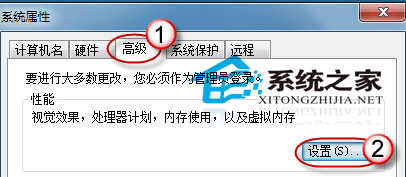 3.跳出“系统属性”对话框后,在“高级”选项卡中点选性能“设置”按钮。