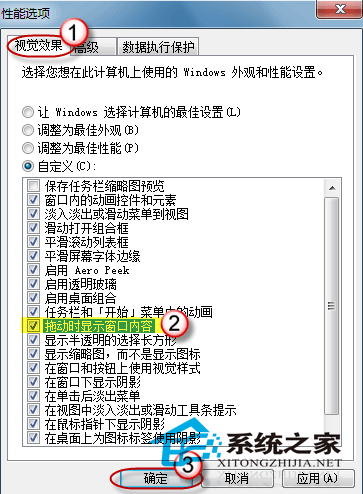 4.在“视觉效果”栏中找到“拖动时显示窗口内容”项,选中这个选项就可以了。最后按“确定”退出。