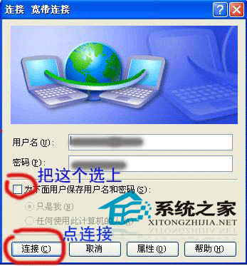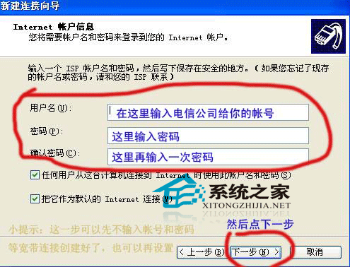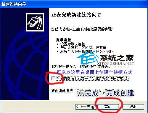 点完成弹出宽带连接对话框 完成,刚才前面没有输入用户名和密码的现在可以在这里输入现在可以看看你的 网络连接里面已经多了个宽带连接了要是已经设置了请直接点连接开始上网吧!