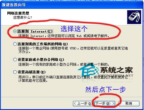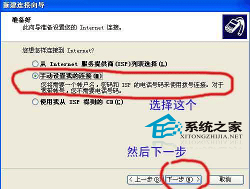 3 屏幕上会弹出一个新建连接向导,依次点击下一步-----(1.)连接到INTELNET,(2.)选择手动设置连接