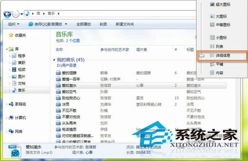 第一步:更改文件夹视图。打开Win7正版系统资源管理器,进入存储MP3音乐的文件夹,单击窗口右上角“更改您的视图”按钮右侧的“▼”,在弹出的下拉列表中选择“详细信息”,将当前文件夹视设置为“详细信息”模式,每首MP3音乐的相关信息一目了然,如果其中存在的错误,可以看得清清楚楚(如图1)。