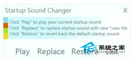 Startup Sound Changer体积仅318K,不需要安装就可以使用。运行该软件前,准备好.wav格式的音乐,接着“replace”,选择准备的音乐;如果替换后不好听,点击“restore”可以换回系统自带的音乐