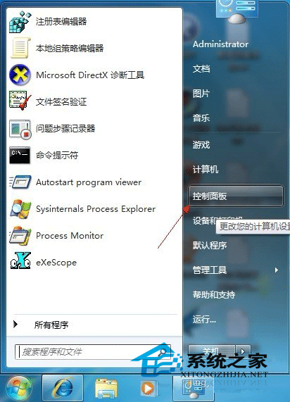 单击桌面左下方的“开始”按钮,在弹出的窗口右侧中再单击“控制面板”