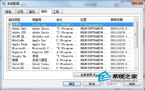 在“启动”选项卡下将全部复选框去勾,然后单击确定