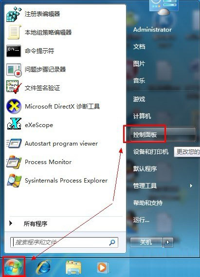 1.单击左下角的“开始”菜单,出来的窗口单击“控制面板”项