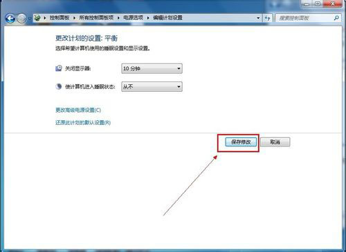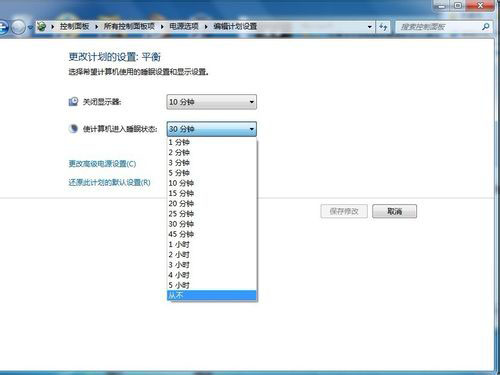 4.单击使计算机进入睡眠状态的箭头按钮,打开的下拉菜单选择“从不”