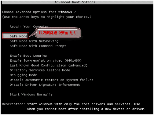 启动计算机时,在系统进入 Windows 启动画面前,按下 F8 键;出现操作系统多模式启动菜单后,用键盘上的方向键选择“SafeMode”,以安全模式启动计算机。
