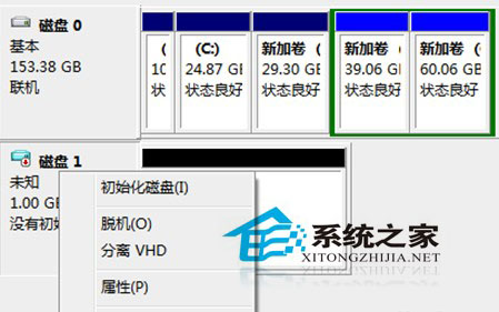 在磁盘管理页面,我们可以看到这个新建的显示为“未知”的磁盘。右键点击选择“初始化磁盘”,之后,我们就可以在这个未分配的磁盘中进行分区了。右键选择“新建简单卷”,在出现的对话框中进行分区,或一直“下一步”,直至完成。