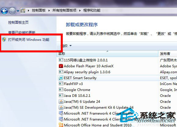 第一步:依次进入控制面板–程序和功能–打开或关闭windows功能,如图: