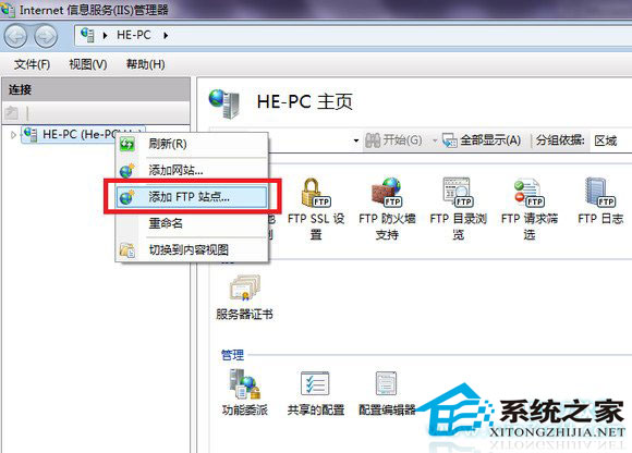 然后选择你的站点,到右边找到查看虚拟目录,然后添加虚拟目录,右键单击你的站点-FTP管理-启动 然后到浏览器中输入,就可访问站点。
