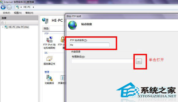 填写站点资料,物理路径填你要让别人访问的文件夹,比如我在E盘建立了名为FTP的文件夹。