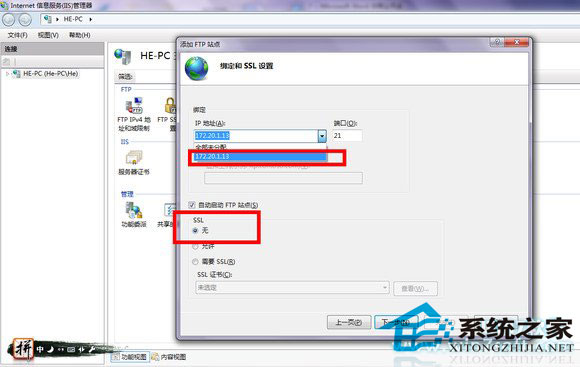 填IP地址,对于校园网之类的局域网记得选内网地址,外网是访问不了的,端口默认21,SSL选无,是否自动启动FTP,自己选,如图
