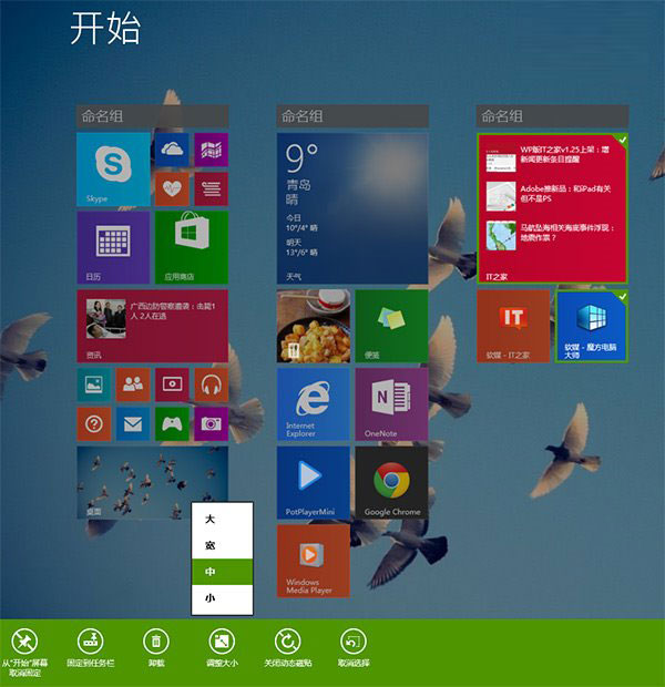 进入Win8.1 Update新版开始屏幕,按下“空格键”,就可以唤出Modern工具栏,支持命名组、多选管理操作等功能。