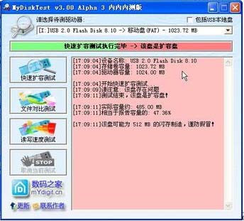 一、我们首先要检测U盘是不是扩容过的,这一步非常简单,下载使用mydesktest这一个工具,插上U盘然后运行软件选择快速扩容盘检测,这里刚好我有个扩容盘做测试,可见结果提示该盘为512m的盘扩容成1g的。