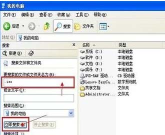 二:在“要搜索的文件或文件夹中名为”文本框中输入:.ico,然后点击“立即搜索”按钮。如图: