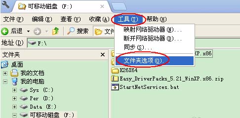 3、这时我们首先判断可能这些文件被隐藏了,这种情况下一般是U盘中毒所导致的。我们先来用一般的方法来解决。打开我的电脑,点击“工具”菜单,再从弹出菜单中选择“文件夹选项”: