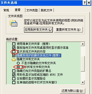 4、在打开的“文件夹选项”对话框中切换到“查看”选项卡,我们再勾选上“显示系统文件夹的内容”复选框,再选择下面的“显示所有文件和文件夹”单选项: