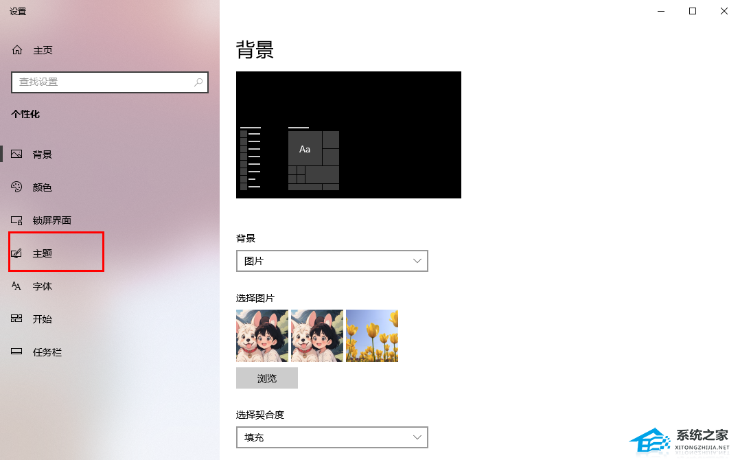 2. 找到个性化页面左侧的【主题】选项,点击进入。