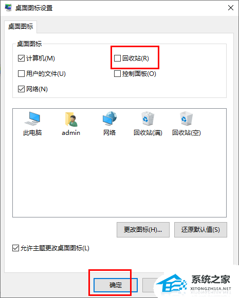 4. 在打开的页面上将【回收站】选项用鼠标点击一下,将其取消勾选,之后点确定按钮。
