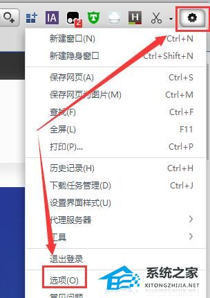 1、点击浏览器右上角的“齿轮”图标。找到下方的“选项”进入。