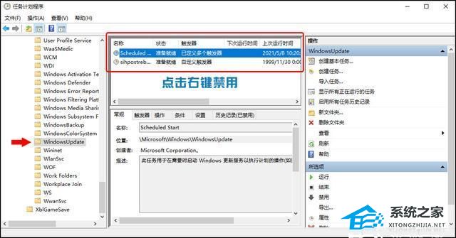 2、在任务计划程序的设置界面,依次展开 任务计划程序库- Microsoft- Windows- WindowsUpdate,把里面的项目都设置为 [ 禁用 ] 就可以了。(我这里边只有一个任务,你的电脑里可能会有2个或者更多,全部禁用就行了)