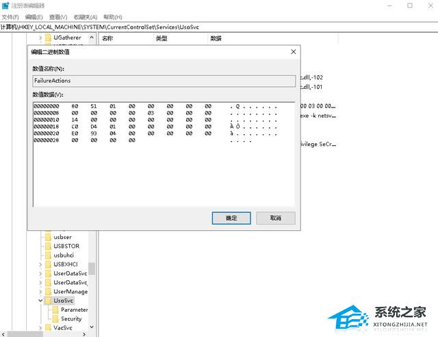 4、继续在右侧找到“FailureActions”键,右键点击修改该键的二进制数据,将“0010”、“0018”行的左起第5个数值由原来的“01”改为“00”,完成后,点击下方的“确定”即可。