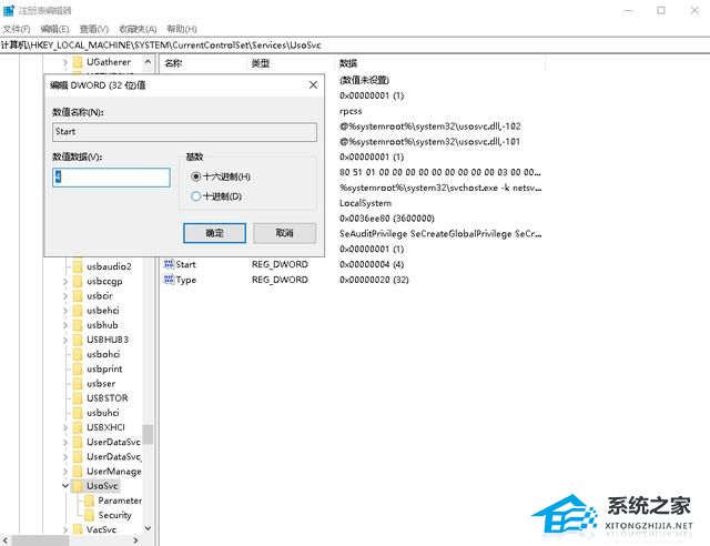 2、在注册表设置中,找到并定位到 [HKEY_LOCAL_MACHINE\SYSTEM\CurrentControlSet\Services\UsoSvc]。然后在右侧找到“Start”键。