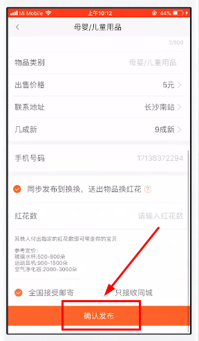 4、输入宝贝标题、描述和出售价格,选择【联系地址和新旧程度】和【交易方式】,点击【确认发布】,二手信息就发布成功啦。
