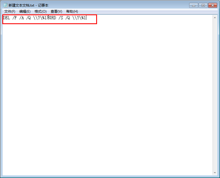 首先新建一个TXT文本,输入代码“DEL /F /A /Q \\?\%1和RD /S /Q \\?\%1”;