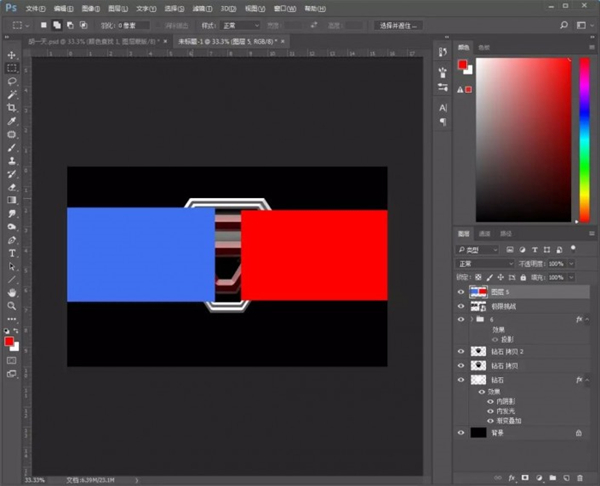 6、把文字素材拖入,分别使用【矩形选框工具】,框选左边两个字和右边两个字,填充蓝色和红色,ctrl+单击文字素材,直接【ctrl+j】复制,然后删掉文字素材图层;